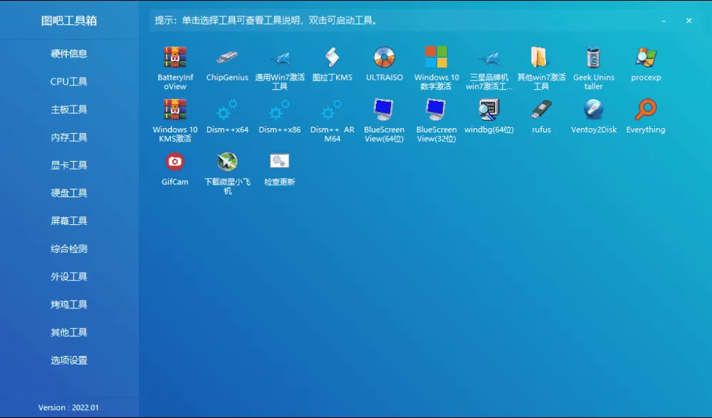 图吧工具箱集成了常用的硬件检测与系统维护等工具,方便图钉使用。工具箱纯绿色,无需安装,无广告推广,不会联网不会捆绑或者诱导用户安装任意程序或改变系统设置,界面清爽大方,适合保存一份到硬盘或U盘,方便日后使用。