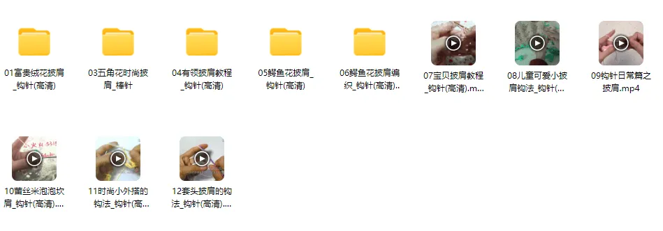 毛衣钩针编织精品款式17个实例: 绒遍讲解 鳄鱼花披肩编织_钩针(高清)(1).mp4 绒遍讲解 富贵绒花披肩1_钩针(高清)(1).mp4 绒遍讲解 富贵绒花披肩2_钩针(高清)(1).mp4 绒遍讲解 富贵绒花披肩3_钩针(高清)(1).mp4 绒遍讲解 富贵绒花披肩4_钩针(高清)(1).mp4 绒遍讲解 富贵绒花披肩5_钩针(高清)(1).mp4 甜甜讲解 双排扣宝宝马甲1_钩针(高清).mp4 甜甜讲解 双排扣宝宝马甲2_钩针(高清).mp4 甜甜讲解 双排扣宝宝马甲3_钩针(高清).mp4 小灿讲解 蕾丝米泡泡坎肩_钩针(高清).mp4 小美讲解 儿童可爱小披肩钩法_钩针(高清).…...