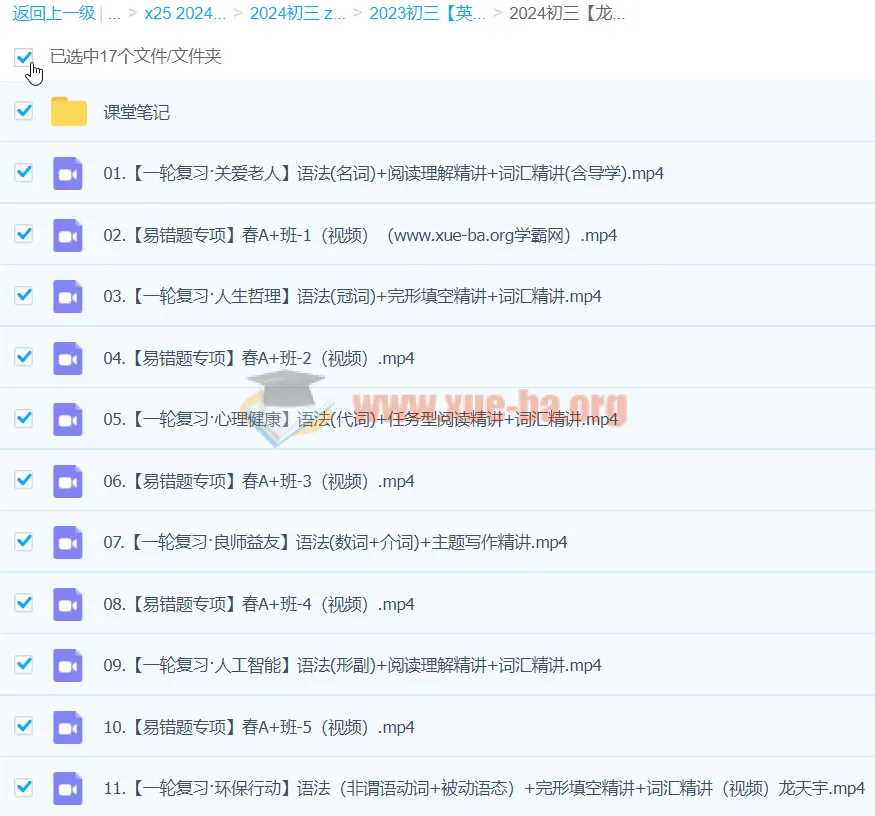 作业帮【2024春下】初三英语全国 龙天宇 A+-百度网盘资源下载地址由网盘用户[晨曦***435]分享,包含mp4等格式共计19个文件,文件大小为4.91GB,分享时间2025-06-02,此百度网盘资源由搜课100网盘搜索引擎收集整理。...