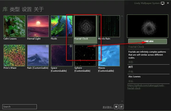 它默认提供了少量动态壁纸,通过拖放文件或链接可以快速添加自己的壁纸,比如视频、图片、网页链接等。点击下方的更多壁纸链接,可以下载作者提供的其它动态壁纸。