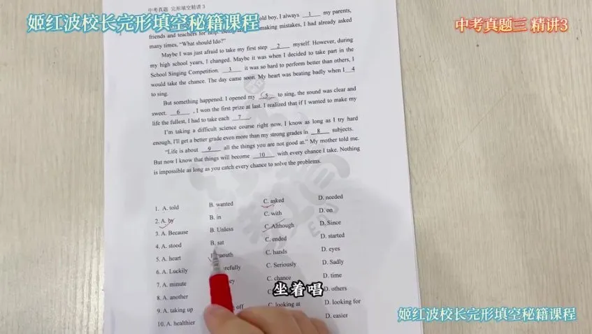 姬红波老师针对初中英语完形填空难点,推出10节系统提分课程。课程精选近年中考真题,分步骤讲解解题技巧:从首句预判到选项分析,从上下文联系到语法验证。每节课聚焦1-2篇典型真题,逐题拆解高频考点,帮助学生掌握”三步排除法”等实用技巧。配套真题演练+错题精讲,快速提升完形填空正确率。适合英语基础薄弱、想系统突破完形填空的初中生,10天集中训练即可显著提高应试能力。