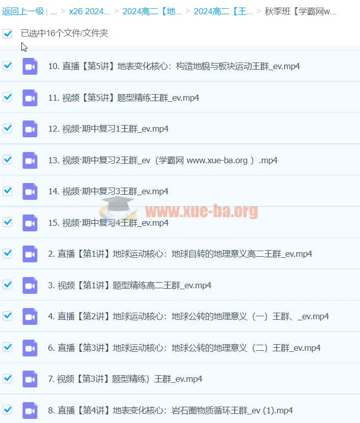 高中地理名师机构课程王群王群 2021秋季 高二地理秋季尖端班(更新中-百度网盘资源下载地址由网盘用户[gus****i90]分享,包含PDF,pdf,mp4等格式共计46个文件,文件大小为19.14GB,分享时间2024-10-26,此百度网盘资源由搜课100网盘搜索引擎收集整理。...