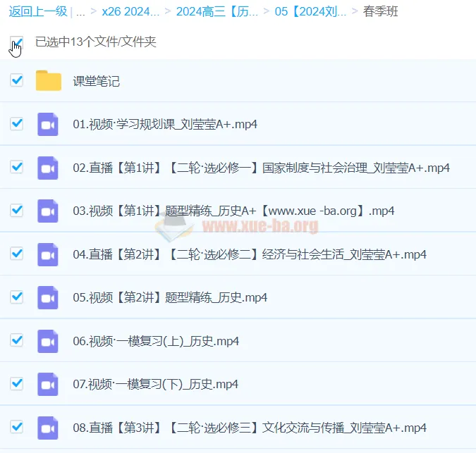 本课程由资深历史教师刘莹莹主讲,专为2024届高三考生打造。课程包含寒假班、春季班完整体系,涵盖国家制度、经济生活、文化交流等选必修核心模块,更提供高考选择题(图表/文言文/史观类)和主观题(原因/论述/史料类)专项突破。配套13讲题型精练+模考复习,助您系统掌握中国与世界史重点,提升解题技巧。附赠学习规划课、课堂笔记及热门材料解析,是冲刺高考历史高分的必备资源!...