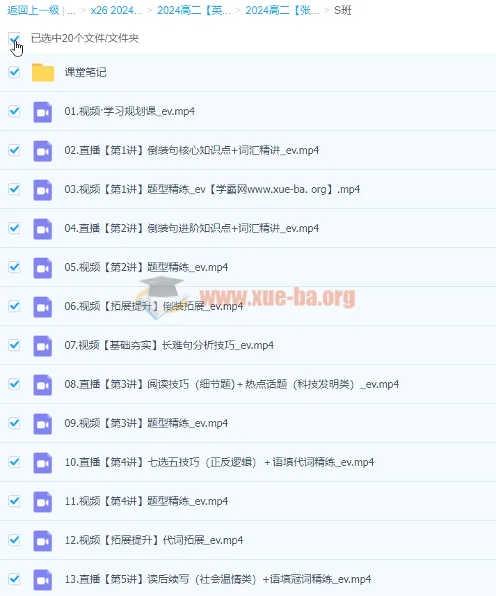 本套资料包含2024届张亮老师高二英语暑假冲顶班全套视频课程(7讲精讲+题型精练)及完整课堂笔记PDF。课程聚焦高考核心考点:倒装句精讲、阅读细节题技巧、七选五正反逻辑、读后续写社会温情类等,配套同源外刊精读和语法填空专项训练(代词/冠词/名词)。适合想系统提升英语能力、冲刺高分的准高三学生,提供科学的暑期学习规划,助你夯实基础、突破难点,掌握高效解题方法。...