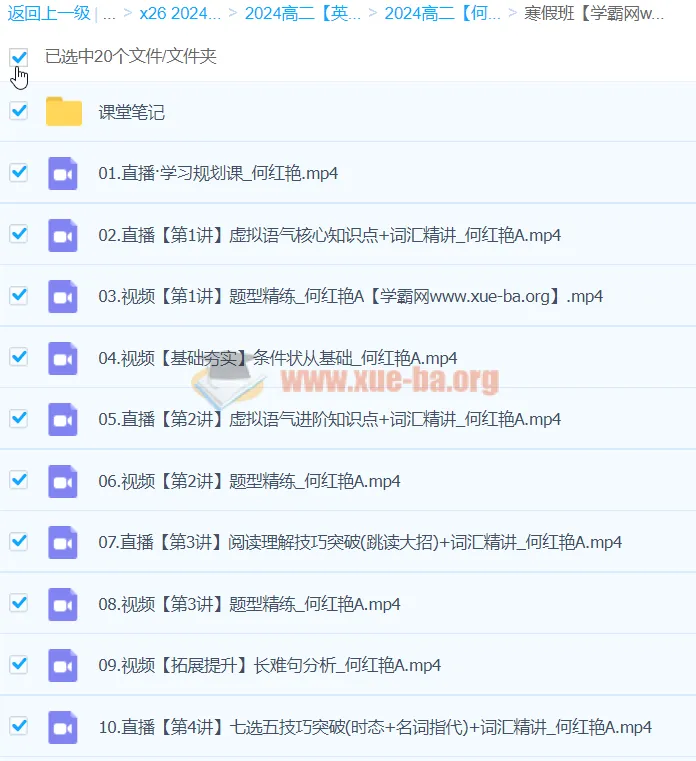 本课程为2023-2024学年高二英语尖端班全套教学资料,由名师何红艳主讲。包含12讲直播课程及配套视频,系统讲解名词性从句、七选五技巧、读后续写等高考核心考点,配备完整课堂笔记和题型精练。特别强化阅读写作手法、完形填空搭配类解题策略,以及图表类写作等高频题型,适合想要突破130分的高二学生。课程涵盖期中复习专题,帮助学生构建完整知识体系,快速提升英语应试能力。...