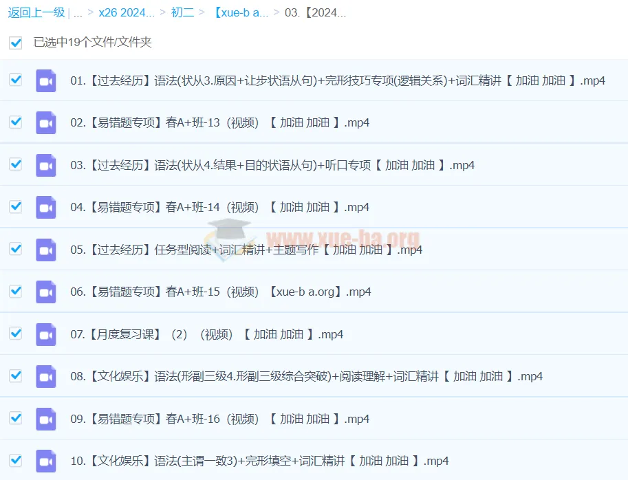 作业帮【2024春下】初二英语全国 王凯娇 A+-百度网盘资源下载地址由网盘用户[晨曦***435]分享,包含mp4等格式共计19个文件,文件大小为6.3GB,分享时间2025-05-31,此百度网盘资源由搜课100网盘搜索引擎收集整理。...