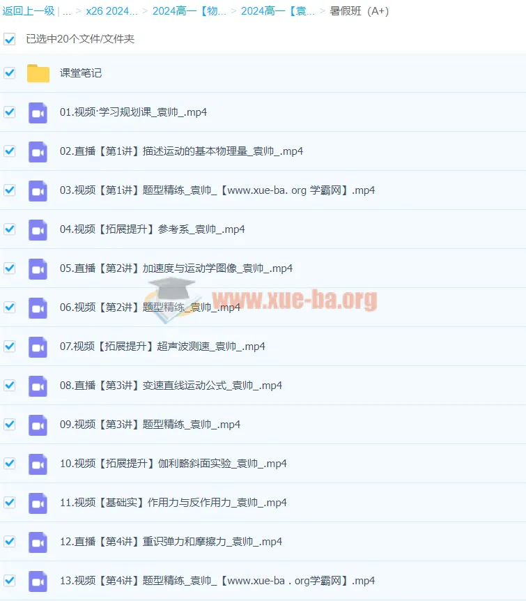 本资料包含2024届高一物理尖端班全套学习资源,由名师袁帅主讲。涵盖运动学、力学、牛顿定律等核心知识点,包含7讲直播课程视频、配套讲义及习题答案、课堂笔记(PDF可打印)。适合暑假预习及同步提升,帮助学生掌握高中物理重难点,包含超声波测速、伽利略实验等拓展内容,助你快速构建物理知识体系,轻松应对新高一挑战。所有资料均为高清电子版,方便随时学习。...