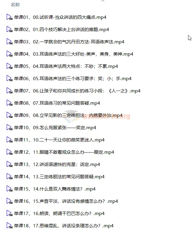 殷亚敏一学就会的演讲视频课。 这门课程由演讲专家殷亚敏亲自授课,旨在教授学员快速掌握出色演讲的技巧。学员将学习演讲准备、表达技巧、舞台表现等内容,通过实例分析和实践演练提升演讲能力。课程简洁明了,让学员轻松掌握成为优秀演讲者的要诀。 ├── 单课01、00.试听课-当众讲话的四大痛点.mp4 ├── 单课02、01.四个技巧解决上台讲话的难题.mp4 ├── 单课03、02.一学就会的气沉丹田方法-耳语练声法.mp4 ├── 单课04、03.耳语练声法的三大好处-美声,美身,美神.mp4 ├── 单课05、04.耳语练声法两大特点:不吵;不累.mp4 ├── 单课06、05.耳语练声法的三个练…...