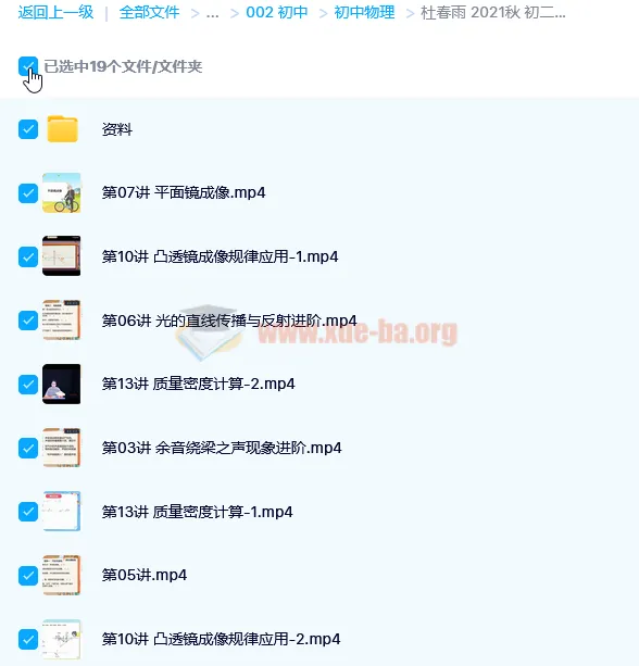 初中物理名师合集课程杜春雨2020春【直播课】初二物理杜春雨菁英班(完结)-百度网盘资源下载地址由网盘用户[lan****ke3]分享,包含pdf,PDF,flv等格式共计23个文件,文件大小为4.55GB,分享时间2024-10-24,此百度网盘资源由搜课100网盘搜索引擎收集整理。...