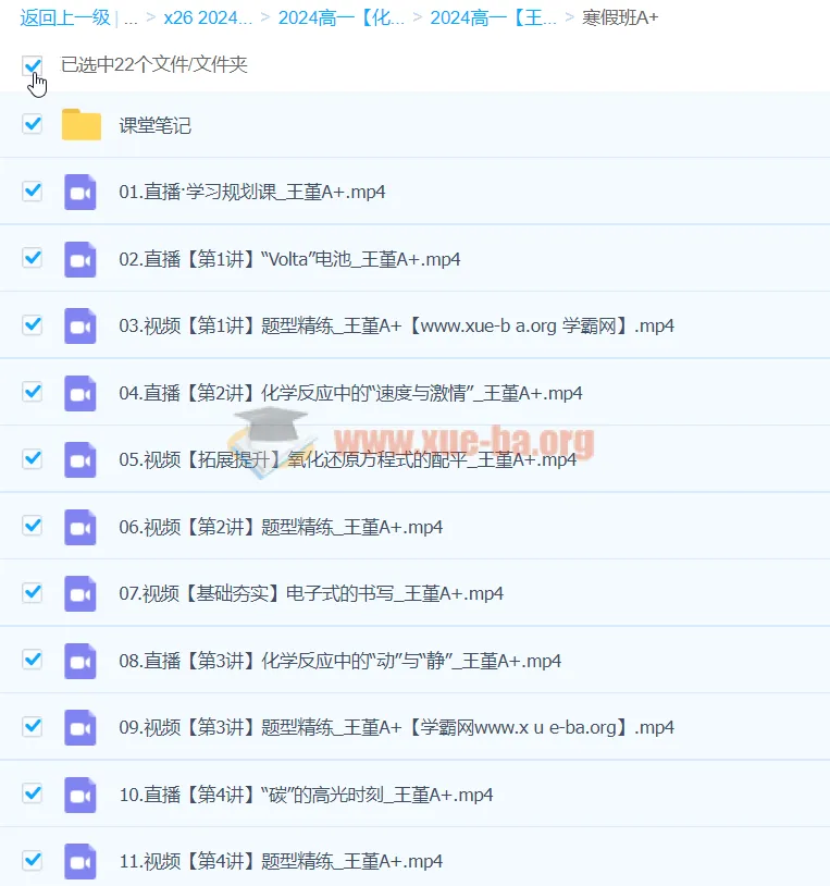 本资料为2024届高一化学寒假特训全套课程,由名师王瑾主讲。包含19节直播/视频课程及配套课堂笔记,系统讲解"Volta电池""化学反应速率""有机化合物"等核心考点,配备题型精练与拓展提升模块。课程特色:1.独创"三步笔记法"梳理知识框架 2.精选高考高频题型实战训练 3.配套电子式书写、氧化还原配平等专项突破。适合想夯实基础、冲刺高分的寒假学习者,帮助学生掌握化学思维方法,为新学期做好充分准备。资料包含PDF笔记+MP4视频,手机电脑均可学习。...