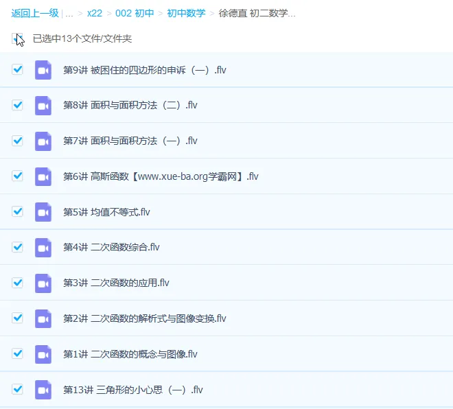 初中数学名师机构课程徐德初二春徐德直目标班-百度网盘资源下载地址由网盘用户[lan****ke3]分享,包含flv等格式共计13个文件,文件大小为4.51GB,分享时间2024-10-25,此百度网盘资源由搜课100网盘搜索引擎收集整理。...