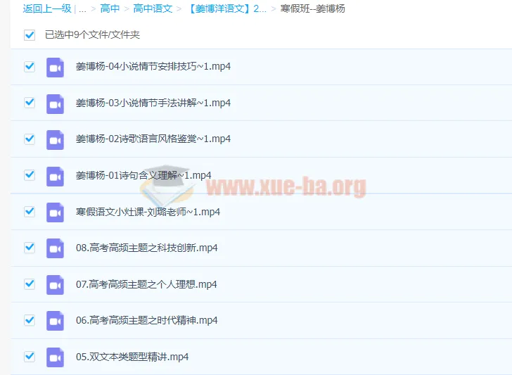 高中语文高考冲刺高考复习姜博扬2022届高考语文二轮复习寒春联报-百度网盘资源下载地址由网盘用户[gus****i90]分享,包含mp4,PDF等格式共计25个文件,文件大小为6.62GB,分享时间2024-10-25,此百度网盘资源由搜课100网盘搜索引擎收集整理。...
