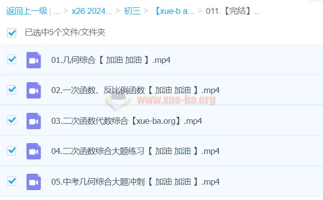 初中数学中考冲刺中考辅导09中考数学寒春联报班(完结)20个视频-百度网盘资源下载地址由网盘用户[lan****ke3]分享,包含mp4,PDF,pdf等格式共计25个文件,文件大小为8.91GB,分享时间2024-10-24,此百度网盘资源由搜课100网盘搜索引擎收集整理。...
