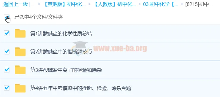 初中化学名师机构课程作业帮【8215-4讲】初中化学难点突破酸、碱、盐【潘鹏飞】-百度网盘资源下载地址由网盘用户[lan****ke3]分享,包含pdf,docx,txt,PDF,mp4等格式共计33个文件,文件大小为613.87MB,分享时间2024-10-24,此百度网盘资源由搜课100网盘搜索引擎收集整理。...