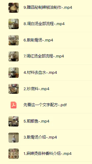 新版麻辣烫全套技术 [1.3G]。 ├── 1.麻辣烫各种香料介绍-.mp4 ├── 2.炒底料-.mp4 ├── 3.熬骨汤介绍-.mp4 ├── 4.材料去血水-.mp4 ├── 5.煎鲫鱼-.mp4 ├── 6.熬制骨汤-.mp4 ├── 7.调红汤全部流程-.mp4 ├── 8.调白汤全部流程-.mp4 ├── 9.赠品秘制辣椒油制作-.mp4 ├── 先看这一个文字配方-.pdf...