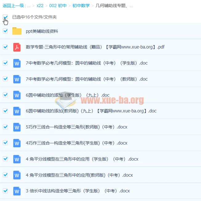 初中数学同步课程几何系列几何辅助线专题、常见构造模型-百度网盘资源下载地址由网盘用户[lan****ke3]分享,包含ppt,pptx,pdf,doc,docx等格式共计25个文件,文件大小为89.55MB,分享时间2024-10-24,此百度网盘资源由搜课100网盘搜索引擎收集整理。...