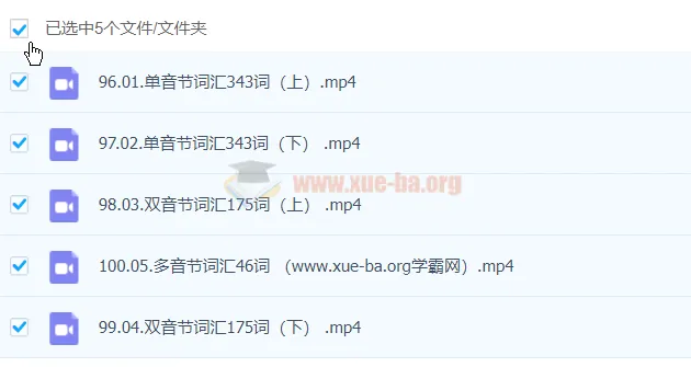 介绍 【毛毛虫】新课标词汇课5节。 【毛毛虫】新课标词汇课5节是一套针对新课程标准设计的英语词汇强化课程,通过高效的教学方法,帮助学生快速掌握新课标要求的核心词汇。课程涵盖词汇讲解、例句示范、记忆技巧与练习巩固等环节,提升学生词汇量,增强词汇运用能力,为英语听说读写全面发展打下坚实基础。 ├── 96.01.单音节词汇343词(上).mp4 ├── 97.02.单音节词汇343词(下).mp4 ├── 98.03.双音节词汇175词(上).mp4 ├── 99.04.双音节词汇175词(下).mp4 ├── 100.05.多音节词汇46词.mp4...