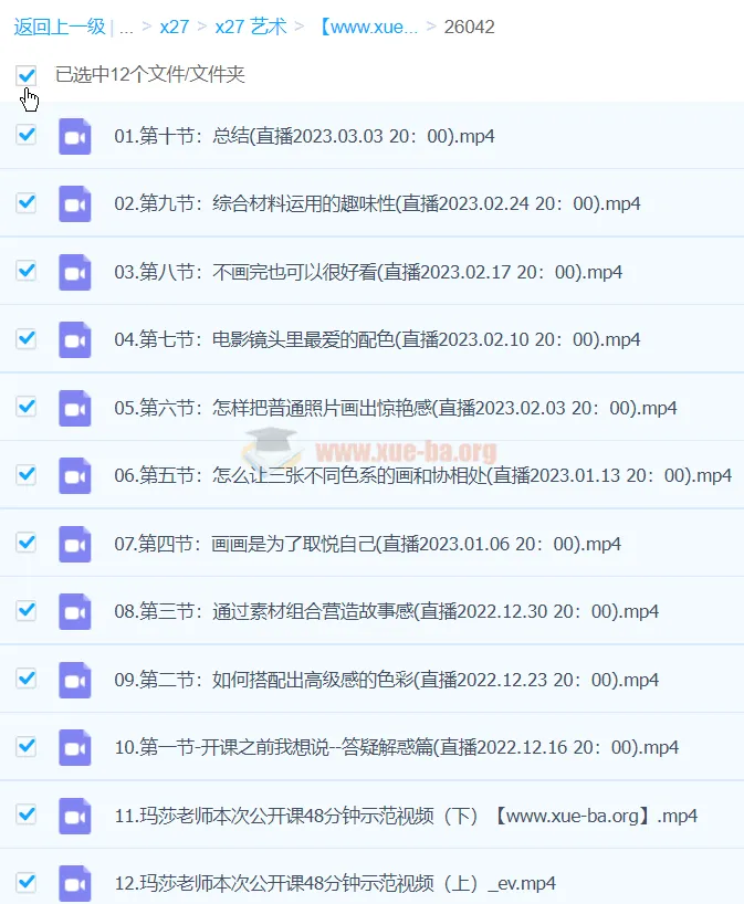 介绍 玛莎油画棒高级灰色系风景课。 本课程专注于灰色系风景油画创作,以玛莎油画棒为媒介,教授高级技法与创意应用。学员将学习灰色调色、光影处理、景深表现等技巧,通过实践作品与导师指导,打造出独具风格的灰色系风景油画作品。 ├── 01.第十节:总结(直播2023.03.03 20:00).mp4 ├── 02.第九节:综合材料运用的趣味性(直播2023.02.24 20:00).mp4 ├── 03.第八节:不画完也可以很好看(直播2023.02.17 20:00).mp4 ├── 04.第七节:电影镜头里最爱的配色(直播2023.02.10 20:00).mp4 ├── 05.第六节:怎样把普…...