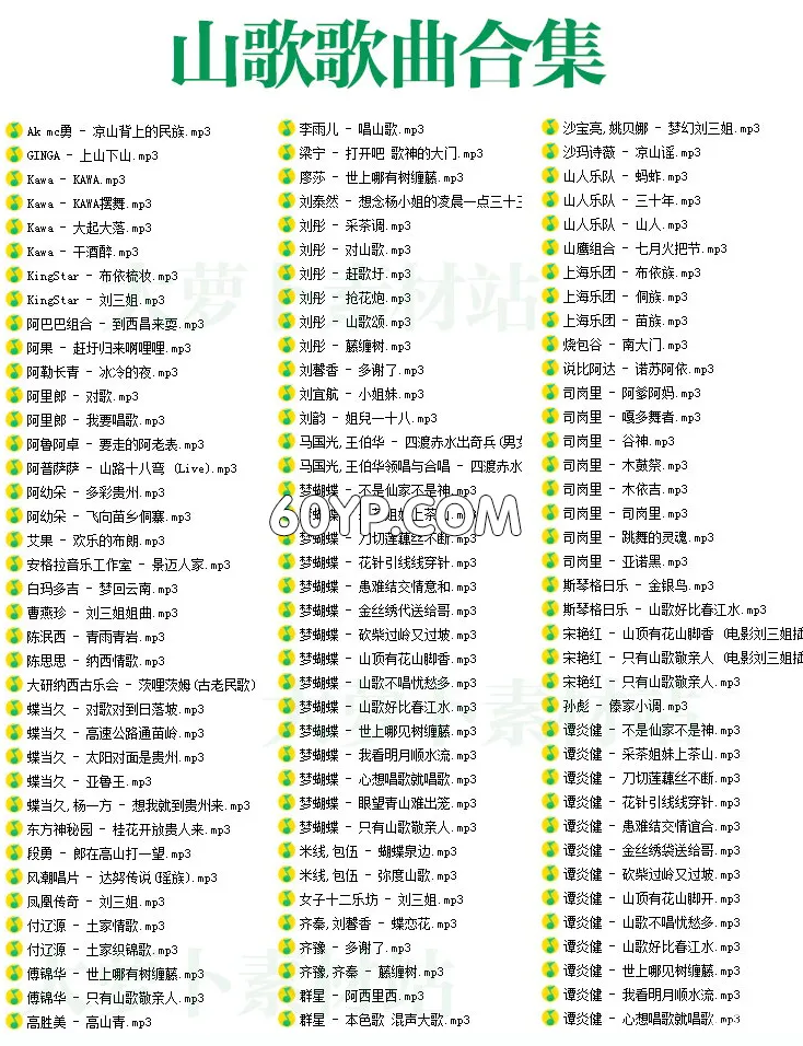 专辑介绍:今天给大家整理分享一些山歌精选,刘三姐,云南、客家、广西、贵州等多种民间小调山歌音乐,山歌主要集中分布在高原、内地、山乡、渔村及少数民族地区。流传极广,蕴藏极丰富。山歌是中国民歌的基本体裁之一。泛指流传于高原、山区、丘陵地区,人们在行路、砍柴、放牧、割草或民间歌会上为了自娱自乐而唱的节奏自由、旋律悠长的民歌。