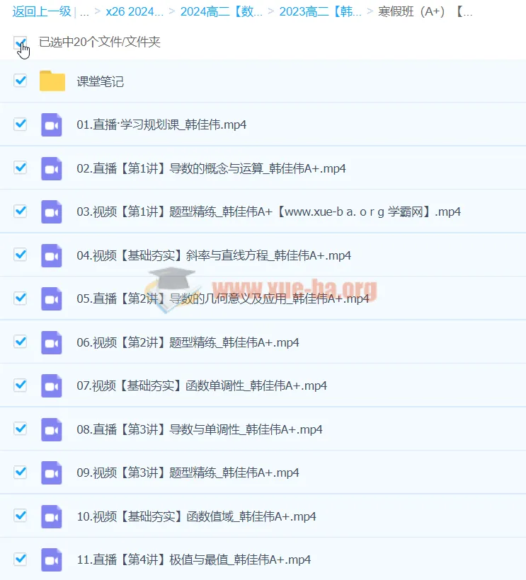 本课程为韩佳伟老师针对高二学生设计的寒假专项提升班,聚焦高考数学两大难点模块:导数(含概念、运算、几何意义、单调性、极值最值)和排列组合(含二项式定理)。通过17节直播+视频课配合19份A+级课堂笔记,系统讲解核心考点,搭配题型精练和拓展提升,帮助学生攻克压轴题。课程包含函数单调性、恒成立问题等专题突破,适合目标985/211院校的学生寒假弯道超车,快速构建解题思维体系,掌握高考数学高分秘诀。...