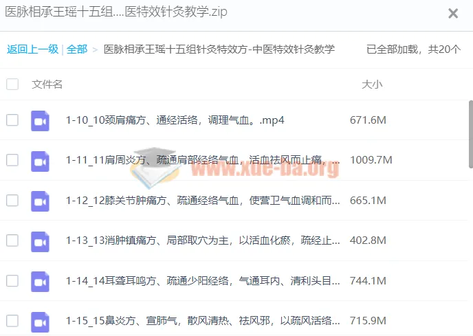 医脉相承王瑶十五组针灸特效方-中医特效针灸教学-夸克网盘资源下载地址由网盘用户[细心*橄榄]分享,包含mp4,txt等格式共计16个文件,文件大小为1.42GB,分享时间2025-05-19,此夸克网盘资源由搜课100网盘搜索引擎收集整理。...