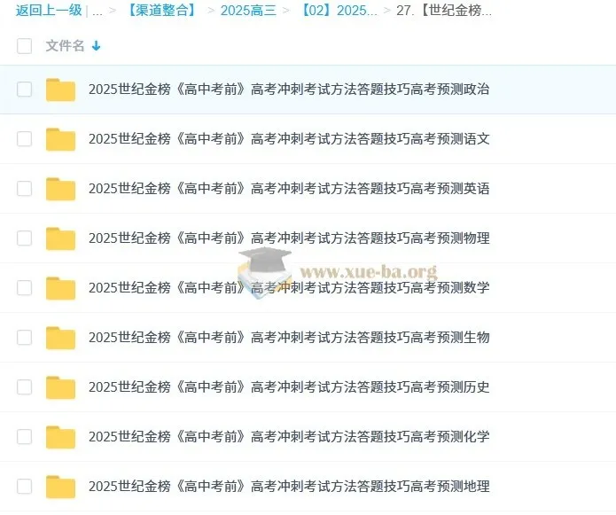[世纪金榜]2025版《高中考前》高考冲刺考试方法答题技巧高考预测(九科全Word版)[494MB] 名称:【世纪金榜】2025版《高中考前》高考冲刺考试方法答题技巧高考预测(九科全Word版) 描述:主要是帮助高中生在高考前夕,通过系统性的复习和应试技巧的学习,提高他们的答题效率和准确率,从而更好地备战高考,取得更好的成绩。...