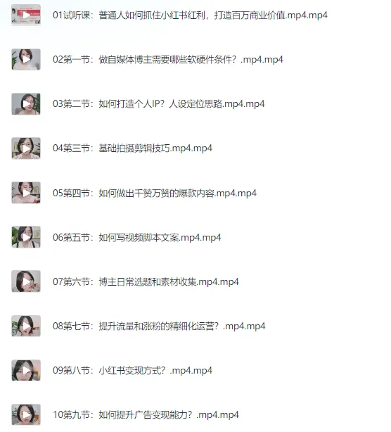 厦九九 – 9节小红书博主赚钱课,课程。 夏九九-9节小红书博主赚钱课是一门全方位指导如何在小红书平台上抓住红利、打造个人IP并实现流量变现的实战课程,旨在帮助普通人构建百万商业价值。课程由试听课带来如何利用小红书红利开启成功之路,深入讲解做自媒体博主所需的软硬件条件、个人形象定位和基础拍摄剪辑技巧,再到如何制作干赞万赞的爆款内容、撰写吸引人的视频脚本文案,以及博主日常的选题和素材收集策略,涵盖精细化运营提升流量与涨粉的核心方法,并详细解析小红书多种变现方式及提升广告变现能力的实用技巧。该课程通过系统化、实用性的教学内容,帮助学员掌握从内容创作到商业变现的全流程操作,助力每位学员在自媒体领域实…...