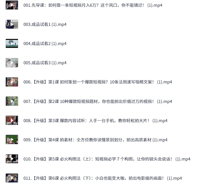 爆火全网的手机短视频变现课,0基础教你拍摄剪辑涨粉运营变现,用一部手机挣钱。 爆火全网的手机短视频变现课,0基础教你拍摄剪辑涨粉运营变现,用一部手机挣钱,本课程由40节视频组成,覆盖短视频从策划、拍摄、剪辑到运营、变现的全流程。通过系统化的讲解和实战案例演示,帮助零基础学员掌握短视频制作要领,实现月入数万的目标。 ├── 001.先导课:如何靠一条短视频月入6万?这个风口,你不能错过! (1).mp4 ├── 003.成品试看1 (1).mp4 ├── 004.成品试看2 (1).mp4 ├── 005.成品试看3 (1).mp4 ├── 006.【升级】第1课 如何策划一个爆款短视频?10条…...