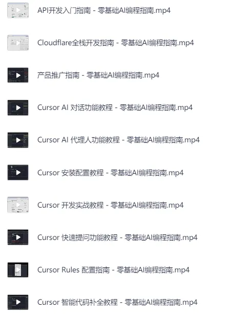 零基础AI编程指南开发变现产品课程,面向零基础与转型开发者,围绕“从想法到上线到变现”的完整链路设计。你将学会配置开发环境,编写与管理代码,使用 AI 辅助工具(Cursor)提效,完成前后端开发与数据库接入,部署到 Vercel/Cloudflare,集成 Stripe 收款,进行数据分析与 SEO/推广,最终把项目落地成可复制的产品。 ├── API开发入门指南 - 零基础AI编程指南.mp4 ├── Cloudflare全栈开发指南 - 零基础AI编程指南.mp4 ├── 产品推广指南 - 零基础AI编程指南.mp4 ├── Cursor AI 对话功能教程 - 零基础AI编程指南.mp…...
