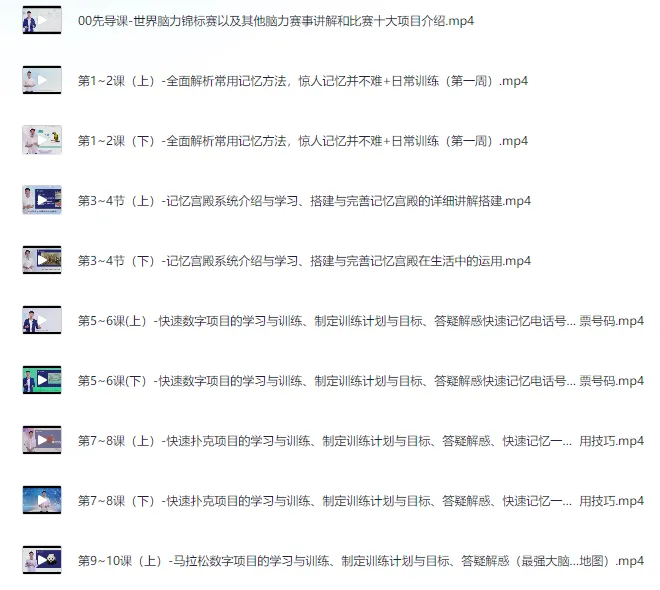 3个月带你成就最强大脑 世界记忆大师考证班。 3个月带你成就最强大脑 世界记忆大师考证班(视频) ├── 00先导课-世界脑力锦标赛以及其他脑力赛事讲解和比赛十大项目介绍.mp4 ├── 第1~2课(上)-全面解析常用记忆方法,惊人记忆并不难+日常训练(第一周).mp4 ├── 第1~2课(下)-全面解析常用记忆方法,惊人记忆并不难+日常训练(第一周).mp4 ├── 第3~4节(上)-记忆宫殿系统介绍与学习、搭建与完善记忆宫殿的详细讲解搭建.mp4 ├── 第3~4节(下)-记忆宫殿系统介绍与学习、搭建与完善记忆宫殿在生活中的运用.mp4 ├── 第5~6课(上)-快速数字项目的学习与训练、…...