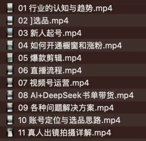 视频号短视频带货 + 直播系统,课程。《视频号短视频带货+直播系统》课程专为想在视频号平台实现商业转化的学员打造。课程系统讲解短视频创作、直播全流程策划、产品推广技巧、观众互动转化及数据分析优化等核心模块,覆盖从内容创作到流量变现的全链路。 课程实战性强,包含行业趋势分析、选品策略、新人起号方法、橱窗开通与涨粉技巧、爆款视频剪辑、直播标准化流程、账号运营心法。特别融入AI书单带货等创新玩法,针对账号定位、真人出镜拍摄等细节提供深度解析,并给出常见问题解决方案。 通过系统学习,学员能高效融合短视频与直播优势,打通流量入口与销售闭环,显著提升品牌竞争力与销售转化效率。 ├── 01 行业的认知与趋…...