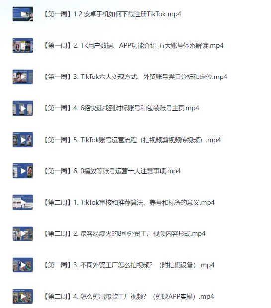 TikTok外贸工厂陪跑训练营。 该训练营旨在帮助工厂在一个月内开拓TK底盘新渠道。课程从认识TK和基础运营开始,共四周,包括第一周的认识TK和账号基础运营,第二周的视频拍摄剪辑实操篇,第三周的账号运营高阶篇,以及第四周的账号运营高阶篇。 训练营针对传统外贸老板、自有品牌出海和外贸工厂主等人群,提供一套成熟的解决方法,帮助他们抓住TK流量和商业变现红利期,精准布局海外TK电商。 课程从认识TK和基础运营开始讲起共四周: 第一周认识TK和账号基础运营 第二周视频拍摄剪辑实操篇 第三周账号运营高阶篇 第四周账号运营高阶篇 你做TK电商是否遇到以下难题? 1、不懂得短视频运营策略? 2、没有专业运营…...