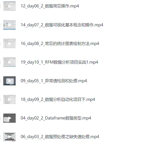 蜗牛学院《轻松入门Python数据分析》,资源下载。 《轻松入门Python数据分析》是一套系统性的学习课程,涵盖了从基础到实战的Python数据分析内容。课程包括20个视频文件,内容涵盖数据分析的基础介绍、pandas库的基本操作、数据预处理(如缺失值、异常值的处理)、数据操作与选择、数据拼接、文件导出、数据可视化,以及完整的数据分析项目实战(如RFM数据分析项目)。...