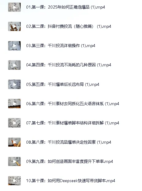 Deepseek千川IP全域爆单进阶,课程。这套课程聚焦抖音电商全域运营,系统拆解2025年爆单核心方法论。课程从爆品筛选逻辑切入,深度解析千川投流底层机制,涵盖随心推基础操作、消耗异常排查、长效经营布局等关键节点,独创素材去同质化五大语言体系与爆单脚本结构拆解方案。