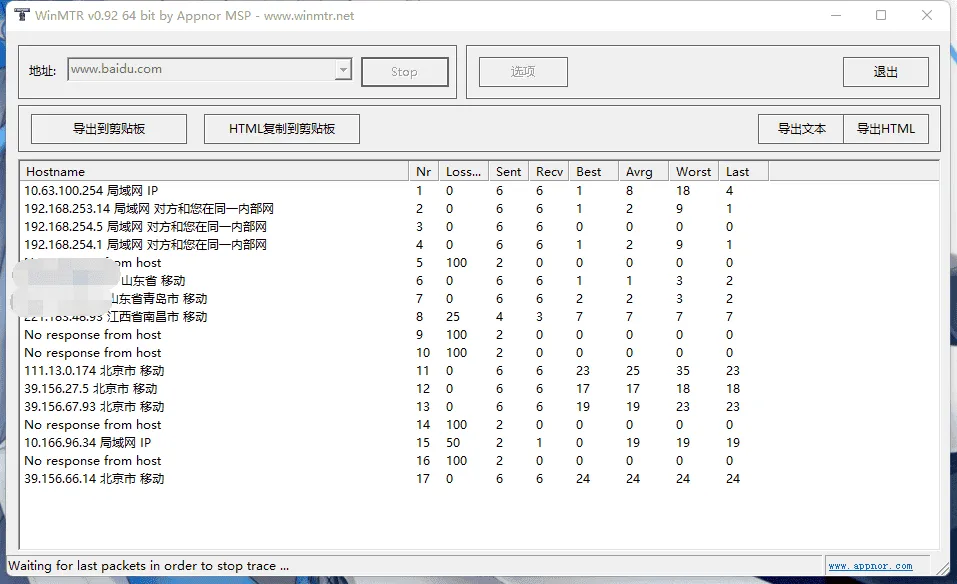 您也可以要求 WinMTR 解析名称,结果显示ID号,发送和接收的数据包