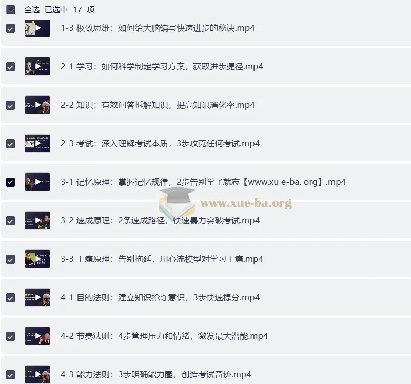 核聚北大学霸私藏的高效学习术。 清华北大考霸金牌教练:教你如何自学成才,打造不可替代的竞争力。学习从来都不是痛苦的,痛苦的是没有找对方法,在错误的道路上踩着坑一路走过去。教你如何自学成才,打造不可替代的竞争力。不要让你的优秀,被错误的方法埋没! ├── 1-1 烧水思维:从学渣到北大博士后的终极奥秘.mp4 ├── 1-2 对标思维:3位清北学霸逆袭背后的思维心法.mp4 ├── 1-3 极致思维:如何给大脑编写快速进步的秘诀.mp4 ├── 2-1 学习:如何科学制定学习方案,获取进步捷径.mp4 ├── 2-2 知识:有效问答拆解知识,提高知识消化率.mp4 ├── 2-3 考试:深入理解…...