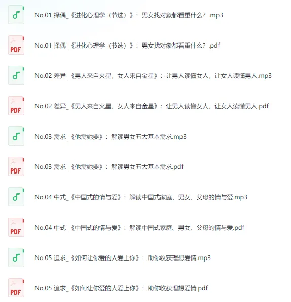 史上最全婚恋指南:如何发现&升级&搞定你的人生伴侣,听这些书就够了,和资源下载。 ├── No.01 择偶_《进化心理学(节选)》:男女找对象都看重什么?.mp3 ├── No.01 择偶_《进化心理学(节选)》:男女找对象都看重什么?.pdf ├── No.02 差异_《男人来自火星,女人来自金星》:让男人读懂女人,让女人读懂男人.mp3 ├── No.02 差异_《男人来自火星,女人来自金星》:让男人读懂女人,让女人读懂男人.pdf ├── No.03 需求_《他需她要》:解读男女五大基本需求.mp3 ├── No.03 需求_《他需她要》:解读男女五大基本需求.pdf ├…...