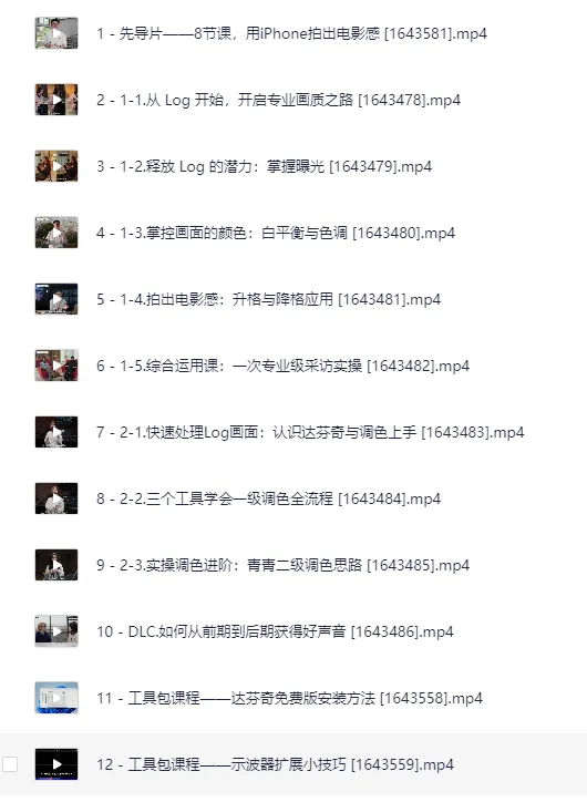 【影视飓风】只看8节课,用iPhone拍出电影感,课程。本系列课程由 8 节精炼视频组成,带学员用 iPhone 实现专业电影质感。课程从 Log 格式入手,讲解噪光处理、白平衡与色调控制、升格与降格运镜在影像氛围营造中的应用,促进画面表现力。综合运用环节以真实采访项目贯穿,帮助掌握拍摄全流程。调色部分以 DaVinci Resolve 免费版为平台,介绍安装方法、示波器使用、一级调色全流程与二级调色思路,并配合“青青”独家调色 LUT,让学员快速上手。工具包课程深入外录硬盘设置及 LUT 自制与导入,提供前后期预设文件包与专属 LUT,助力个人创作和商业项目高效输出。整个体系设计简洁直观,适…...