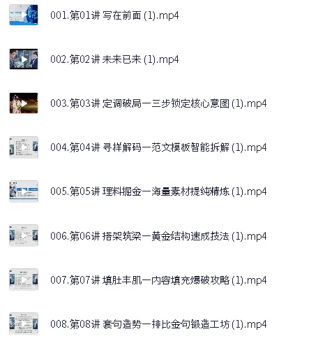 七步成篇:AI写作全攻略线上视频课,用ai搞定写作,每天早下班2小时,课程。本套线上视频课程系统化拆解AI写作全流程,通过十讲内容帮助职场人重构写作模式。开篇从认知层面剖析智能写作发展趋势,结合实战案例展示如何运用AI工具每天节省2小时工作时间。核心教学内容聚焦七大关键步骤:精准定位写作目标、智能拆解优质范文模板、海量信息筛选与提炼、搭建黄金结构框架、智能生成内容填充、排比金句自动生成技术、八维度质检定稿法。 ├── 001.第01讲 写在前面 (1).mp4 ├── 002.第02讲 未来已来 (1).mp4 ├── 003.第03讲 定调破局—三步锁定核心意图 (1).mp4 ├── 00…...