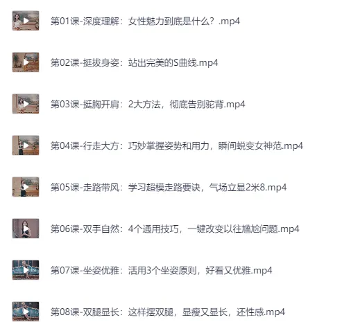亚洲小姐亲授女性魅力提升术,形象塑造与气质修炼课程。 渴望举止优雅,整体形象获得极大提升 体型微胖肉嘟嘟,怎么穿都不好看 不满意自己,想要展现独特魅力 ├── 第01课-深度理解:女性魅力到底是什么?.mp4 ├── 第02课-挺拔身姿:站出完美的S曲线.mp4 ├── 第03课-挺胸开肩:2大方法,彻底告别驼背.mp4 ├── 第04课-行走大方:巧妙掌握姿势和用力,瞬间蜕变女神范.mp4 ├── 第05课-走路带风:学习超模走路要诀,气场立显2米8.mp4 ├── 第06课-双手自然:4个通用技巧,一键改变以往尴尬问题.mp4 ├── 第07课-坐姿优雅:活用3个坐姿原则,好看又优雅.mp…...