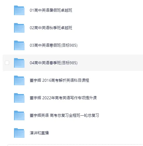董宇辉英语往年课程专题。 ├── 01高中英语暑假班卓越班 ├── 02高中英语秋季班卓越班 ├── 03高中英语寒假班(目标985) ├── 04高中英语春季班(目标985) ├── 董宇辉 2016高考解析英语科目课程 ├── 董宇辉 2022年高考英语写作专项提升课 ├── 董宇辉英语 高考总复习全程班一轮总复习 ├── 演讲和直播...
