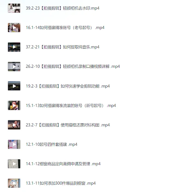 素人IP带货训练营,全平台最强带货IP,让带货变得简单、不再神秘,课程。 《素人IP带货训练营》是一套面向全平台的带货IP打造课程,旨在帮助普通人通过系统化的学习,掌握抖音电商的核心技能,轻松实现带货变现。课程内容涵盖赛道选择、抖音心态调整、繁星计划解读、电商规范用语、行业认知、功能操作、橱窗管理、数据分析、涨粉技巧、账号搭建、爆品添加、高佣申请等基础与进阶知识。课程深入讲解拍摄剪辑技巧,包括设备选择、构图方法、口播录制、视频剪辑、字幕添加、特效处理、背景音乐提取等,帮助学员制作高质量视频内容。此外,课程还提供口播进阶训练,涵盖室内外拍摄技巧、爆款视频创作、普通话训练、声音表现、对标视频复刻及…...