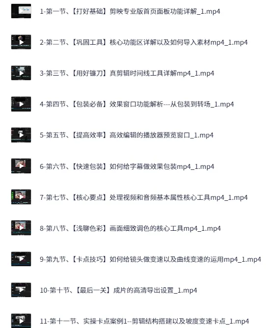 介绍 剪映电脑版进阶拔高案例实操。 《剪映电脑版进阶拔高案例实操》课程专为有一定基础的剪辑师设计,帮助学员在剪映电脑版上提升剪辑水平。课程通过真实案例解析,教授高级剪辑技巧、特效运用和音视频同步等实战内容,助力学员打造更加专业、高质量的剪辑作品,提升创作能力和市场竞争力。 ├── 1-第一节、【打好基础】剪映专业版首页面板功能详解_1.mp4 ├── 2-第二节、【巩固工具】核心功能区详解以及如何导入素材mp4_1.mp4 ├── 3-第三节、【用好镰刀】真剪辑时间线工具详解mp4_1.mp4 ├── 4-第四节、【包装必备】效果窗口功能解析---从包装到转场_1.mp4 ├── 5-第五节、…...