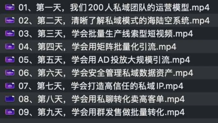 9天带你理顺私域模式各个环节,这套为期9天的私域运营专项课程,通过系统化训练和实操任务,帮助学员全面掌握私域流量的拉新、留存和转化。课程涵盖从短视频线索获取、矩阵化批量引流,到广告投放与社群精细化运营,逐步建立可持续的私域增长体系。 ├── 01、第一天,我们200人私域团队的运营模型.mp4 ├── 02、第二天,清晰了解私域模式的海陆空系统.mp4 ├── 03、第三天,学会批量生产线索型短视频.mp4 ├── 04、第四天,学会用矩阵批量化引流.mp4 ├── 05、第五天,学会用AD投放大规模引流.mp4 ├── 06、第六天,学会安全管理私域数据资产.mp4 ├── 07、第七天,学…...