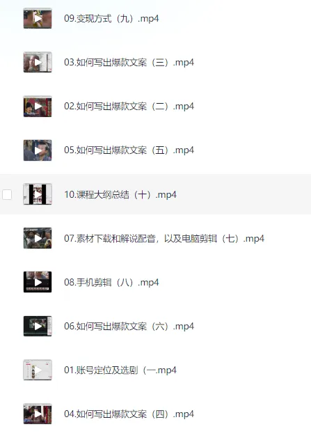 新手0基础入门做影视解说培训。 这个新手 0 基础入门培训课程旨在帮助初学者掌握影视解说的基本技巧。通过系统的理论讲解和实践演练,学员将学会如何提高嗓音、表达技巧和声音处理。这个课程将为您提供必要的知识和技能,成为一名出色的影视解说员! ├── 01.账号定位及选剧(一.mp4 ├── 02.如何写出爆款文案(二).mp4 ├── 03.如何写出爆款文案(三).mp4 ├── 04.如何写出爆款文案(四).mp4 ├── 05.如何写出爆款文案(五).mp4 ├── 06.如何写出爆款文案(六).mp4 ├── 07.素材下载和解说配音,以及电脑剪辑(七).mp4 ├── 08.手机剪辑(八)…...