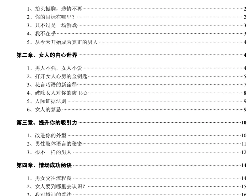 这门课程深入探讨了情场中必备的致胜策略,通过强化心理建设和了解女性内心需求,帮助学员提升个人魅力,构建自信成熟的形象。课程从树立正确心态、明确自我目标入手,教你如何摆脱负面情绪,成为真正有担当的男人;剖析女性对男性感知的核心要素,解密打开心扉的关键和女性心理的隐秘规则;传授提升外型、肢体语言等提升吸引力的方法,并通过实际交往流程和策略,让学员掌握男女关系中互动与沟通的艺术,最终在恋爱过程中实现自我突破与成功。引用来源:基于提供的课程目录内容。 ├── 你不可不知的情场致胜秘密.pdf...