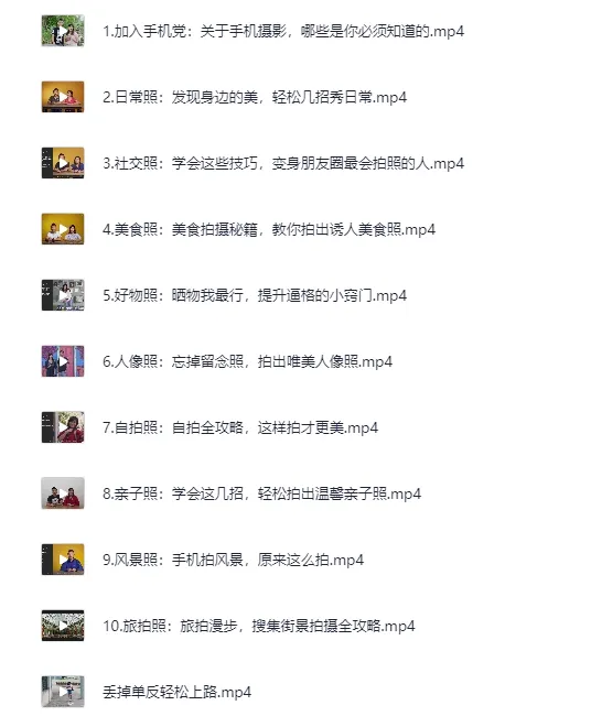 《手机摄影原来这么拍》B站付费课程 教你手机拍摄出大片[mp4]-夸克网盘资源下载地址由网盘用户[不屈*挠的梨子]分享,包含png,mp4等格式共计12个文件,文件大小为3.01GB,分享时间2025-03-18,此夸克网盘资源由搜课100网盘搜索引擎收集整理。...