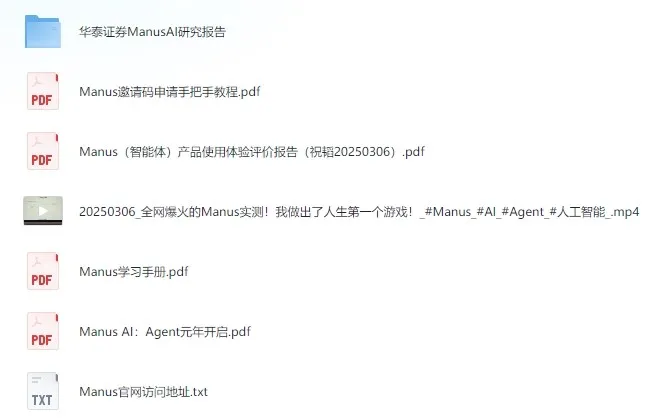 Manus全网最全资料 Manus邀请码申请手把手教程(持续更新中,收藏这一个就够了),资源。 Manus AI作为AI代理领域的领跑者,这份持续更新的资源合集堪称行业百宝箱,涵盖技术白皮书、实战教程、券商研报等硬核内容。从官网访问指南到邀请码申请手把手教学,解决新手入门难题;华泰证券深度报告揭示AI代理赛道的投资逻辑,搭配平台核心架构解析,助开发者快速掌握智能体开发全流程。无论你是技术极客寻找API接入方案,还是企业决策者评估AI落地场景,这里聚合的文档都能满足需求——包括最新算法模型解读、多行业应用案例及生态合作政策。 ├── 20250306_全网爆火的Manus实测!我做出了人生第一个…...