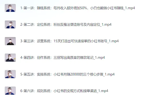 金牌导师教你运营小红书,0基础进阶赚钱博主训练课,课程。 本课程由金牌导师亲自授课,专为零基础学员量身打造,助你在小红书上快速转型为赚钱博主。课程通过详细讲解赚钱系统,帮助学员实现每月收入额外增长50%的目标,运用粉丝反推法精准定位账号与内容,15天内打造可快速接单的小红书账号,再通过三招技巧写出高质量爆款笔记,解锁月赚20000的核心实操步骤,并深入解析小红书变现方式和接单渠道。该课程内容全面、实战性强,旨在让学员突破初学者的局限,快速掌握小红书运营的精髓,实现从零基础到赚钱博主的华丽转变。 ├── 1-第一讲:赚钱系统:每月收入额外增加50%,小白也能做小红书赚钱_1.mp4 ├── 2-…...