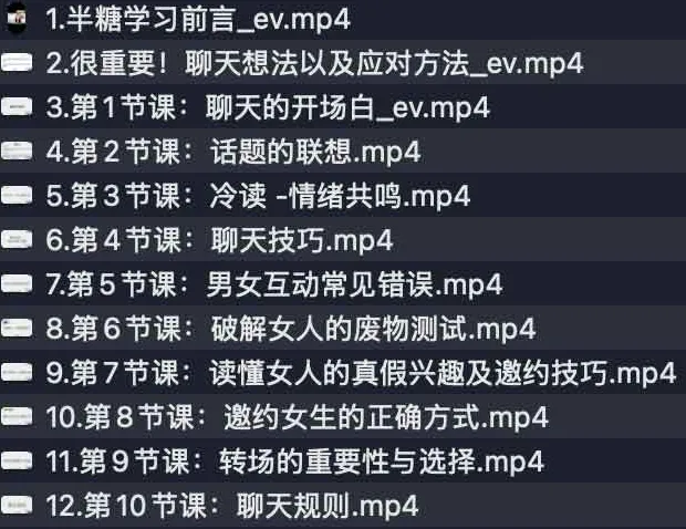 介绍 半糖课程学习:提升异性聊天质感,轻松牵手丘比特,资源。 牵手丘比特推出的《半糖课程学习》由十一段精心制作的视频组成,全面围绕从心态准备到实际邀约的完整流程展开。 这套课程兼顾理论与实战,旨在帮助学员在与异性交谈时,既能保持自然真诚,又能巧妙地引导对方情绪,显著提高互动质量。 课程内容环环相扣,覆盖从心态准备到邀约落地的每一个步骤,非常适合希望提升异性聊天质感、增强情感吸引力的学员反复观看与练习。...